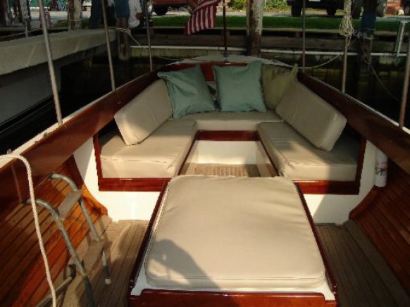 This classic picnic boat needed new cushion covers, and pillows. She had also just had her brightwork redone. What a beauty!